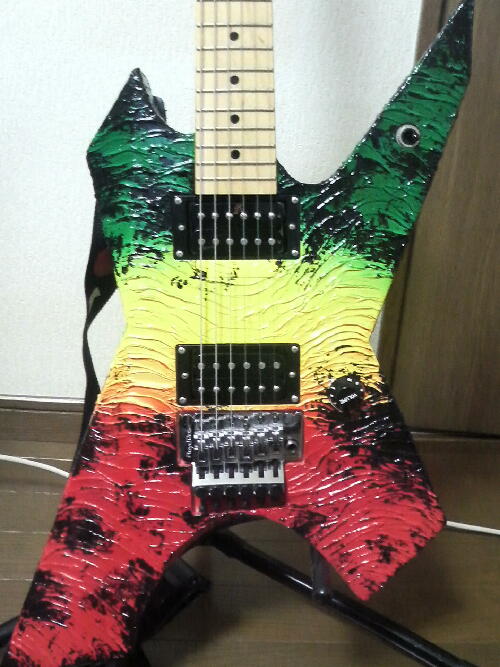 Body:Maple Neck:Hard Maple 1P/VU Shape Scale:648mm Frets:22 Neck Joint:Deep Insert Front Pickup:LQ-500 Rear Pickup:Dyna-Bite Controls:Master VolSelect SW Bridge:Floyd Rose Original Color:Oil Painted Rasta |